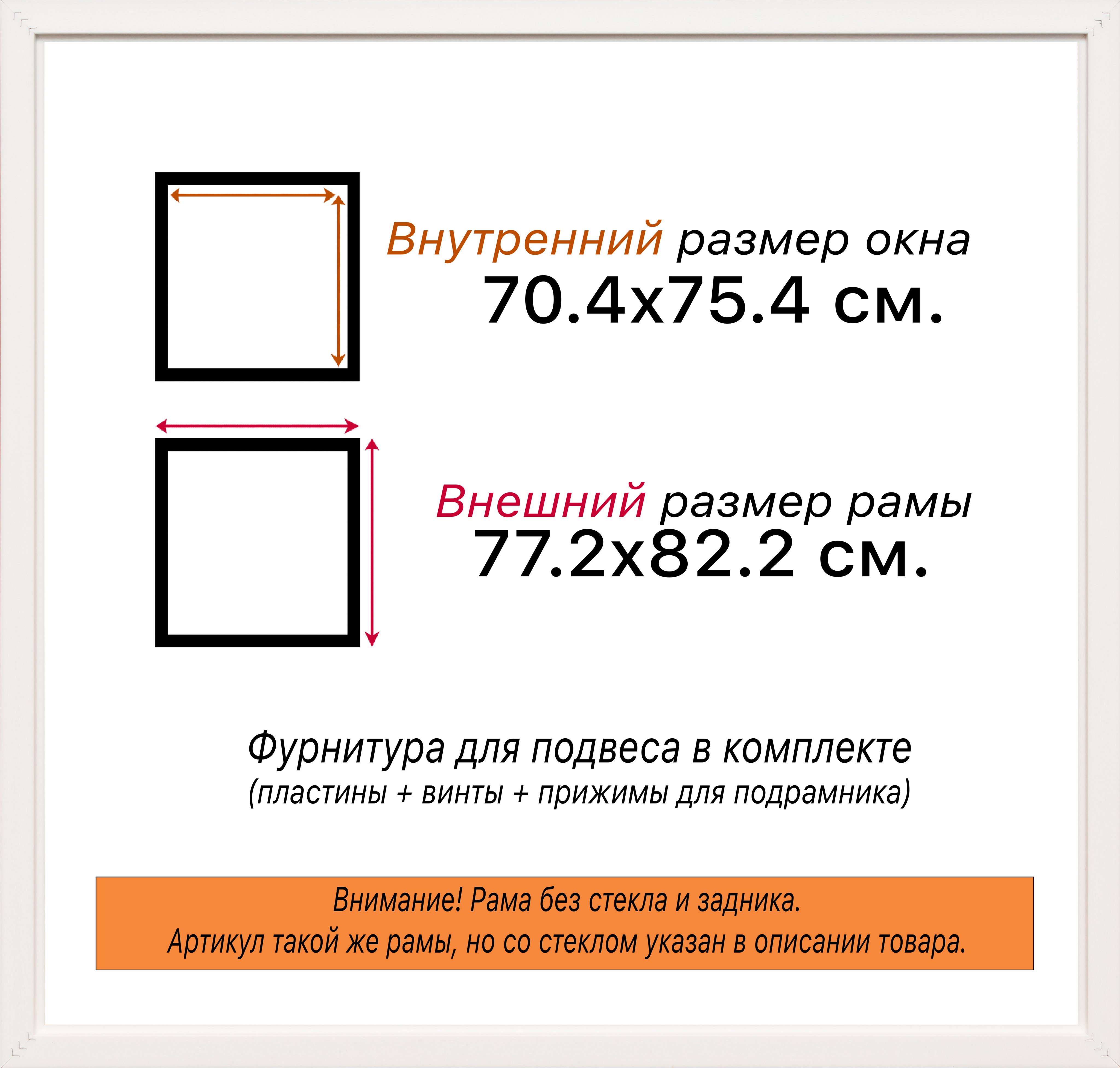 Пластиковая рама 70x75 без стекла и задника Пластиковая рама без стекла и задника изготовлена из безопасного и экологически чистого первичного полистирола высшей категории. Производитель: “ВсеПодрамники”. Для удобства установки к стандартному размеру добавлено 4 мм (по 2 мм с каждой стороны), чтобы ваше изделие легко поместилось в раму. 1. Основные характеристики: - Размеры рамки: 70x75 (по размеру помещаемого изображения) - Габариты изделия: 77.2x82.2 см. - Цвет: супер белый - Профиль: классический - Сечение рамы: 41x15 мм - Ширина четверти: 7 мм - Высота четверти: 10 мм 2. Комплектация: - Подвесная пластина – 2 шт. - Прижимы для подрамника - Винты 3. Назначение: - Подходит для оформления: • Картин, включая картины по номерам • Алмазных мозаик и вышивок крестом • Постеров, фотографий, икон • Паспарту, зеркал • Вышивки бисером и алмазной мозаики • Медалей, орденов, спортивных наград • Старинных часов, ключей, монет или украшений - Используется как настенная или настольная фоторамка (нет подставки) 4. Преимущества: - Универсальность: квадратные и прямоугольные форматы, размеры от 10х10 до 100х100 см - Удобство: можно повесить горизонтально или вертикально - Широкий выбор: разные профили, расцветки, с опцией со стеклом или без - Идеальный подарок: для мамы, папы, бабушки, дедушки, друзей, коллег на день рождения, Новый год, 8 марта, 23 февраля, свадьбу, новоселье или любой другой праздник 5. Применение в интерьере: - Идеально для алмазной вышивки, мозаики, картин на подрамнике - Украшение дома: подходит для изображений цветов, живописи, портретов, натюрмортов, городских пейзажей, природы 6. Производство: - Страна: Россия, Санкт-Петербург - Качество: высококачественные материалы с вниманием к деталям