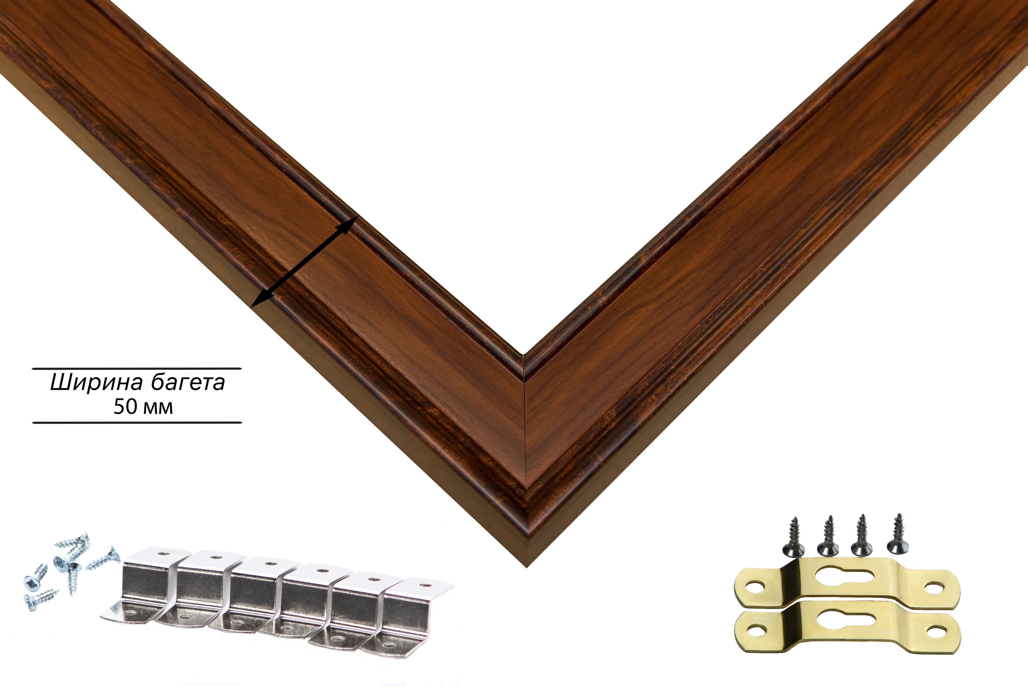 Пластиковая рама 85x90 без стекла и задника Пластиковая рама без стекла и задника изготовлена из безопасного и экологически чистого первичного полистирола высшей категории. Производитель: “ВсеПодрамники”. Для удобства установки к стандартному размеру добавлено 4 мм (по 2 мм с каждой стороны), чтобы ваше изделие легко поместилось в раму. 1. Основные характеристики: - Размеры рамки: 85x90 (по размеру помещаемого изображения) - Габариты изделия: 94.0x99.0 см. - Цвет: коричневый - Профиль: классический - Сечение рамы: 50x30 мм - Ширина четверти: 7 мм - Высота четверти: 10 мм 2. Комплектация: - Подвесная пластина – 2 шт. - Прижимы для подрамника - Винты 3. Назначение: - Подходит для оформления: • Картин, включая картины по номерам • Алмазных мозаик и вышивок крестом • Постеров, фотографий, икон • Паспарту, зеркал • Вышивки бисером и алмазной мозаики • Медалей, орденов, спортивных наград • Старинных часов, ключей, монет или украшений - Используется как настенная или настольная фоторамка (нет подставки) 4. Преимущества: - Универсальность: квадратные и прямоугольные форматы, размеры от 10х10 до 100х100 см - Удобство: можно повесить горизонтально или вертикально - Широкий выбор: разные профили, расцветки, с опцией со стеклом или без - Идеальный подарок: для мамы, папы, бабушки, дедушки, друзей, коллег на день рождения, Новый год, 8 марта, 23 февраля, свадьбу, новоселье или любой другой праздник 5. Применение в интерьере: - Идеально для алмазной вышивки, мозаики, картин на подрамнике - Украшение дома: подходит для изображений цветов, живописи, портретов, натюрмортов, городских пейзажей, природы 6. Производство: - Страна: Россия, Санкт-Петербург - Качество: высококачественные материалы с вниманием к деталям