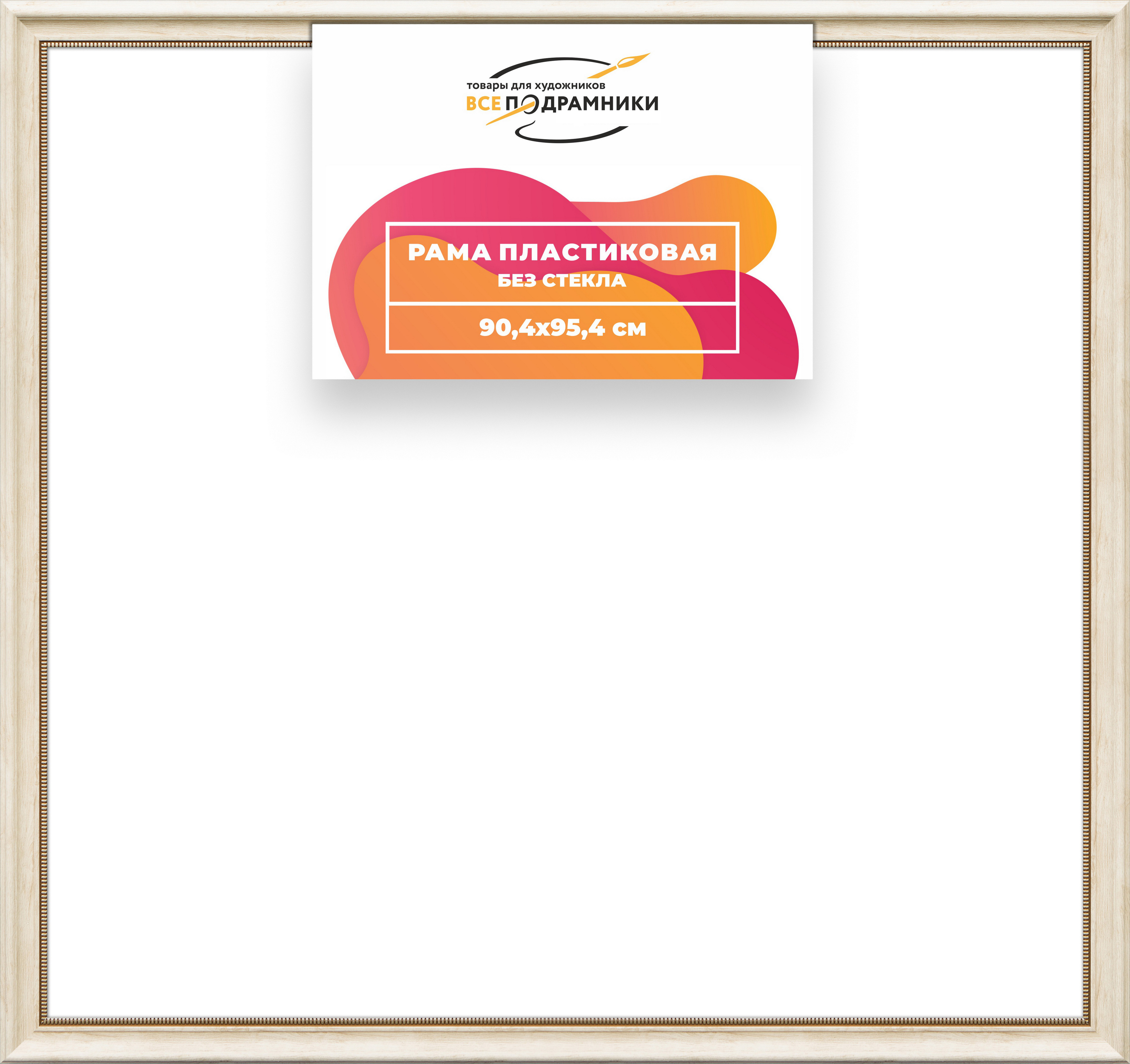 Пластиковая рама 90x95 без стекла и задника Пластиковая рама без стекла и задника изготовлена из безопасного и экологически чистого первичного полистирола высшей категории. Производитель: “ВсеПодрамники”. Для удобства установки к стандартному размеру добавлено 4 мм (по 2 мм с каждой стороны), чтобы ваше изделие легко поместилось в раму. 1. Основные характеристики: - Размеры рамки: 90x95 (по размеру помещаемого изображения) - Габариты изделия: 99.0x104.0 см. - Цвет: кремовый - Профиль: классический - Сечение рамы: 50x26 мм - Ширина четверти: 7 мм - Высота четверти: 10 мм 2. Комплектация: - Подвесная пластина – 2 шт. - Прижимы для подрамника - Винты 3. Назначение: - Подходит для оформления: • Картин, включая картины по номерам • Алмазных мозаик и вышивок крестом • Постеров, фотографий, икон • Паспарту, зеркал • Вышивки бисером и алмазной мозаики • Медалей, орденов, спортивных наград • Старинных часов, ключей, монет или украшений - Используется как настенная или настольная фоторамка (нет подставки) 4. Преимущества: - Универсальность: квадратные и прямоугольные форматы, размеры от 10х10 до 100х100 см - Удобство: можно повесить горизонтально или вертикально - Широкий выбор: разные профили, расцветки, с опцией со стеклом или без - Идеальный подарок: для мамы, папы, бабушки, дедушки, друзей, коллег на день рождения, Новый год, 8 марта, 23 февраля, свадьбу, новоселье или любой другой праздник 5. Применение в интерьере: - Идеально для алмазной вышивки, мозаики, картин на подрамнике - Украшение дома: подходит для изображений цветов, живописи, портретов, натюрмортов, городских пейзажей, природы 6. Производство: - Страна: Россия, Санкт-Петербург - Качество: высококачественные материалы с вниманием к деталям