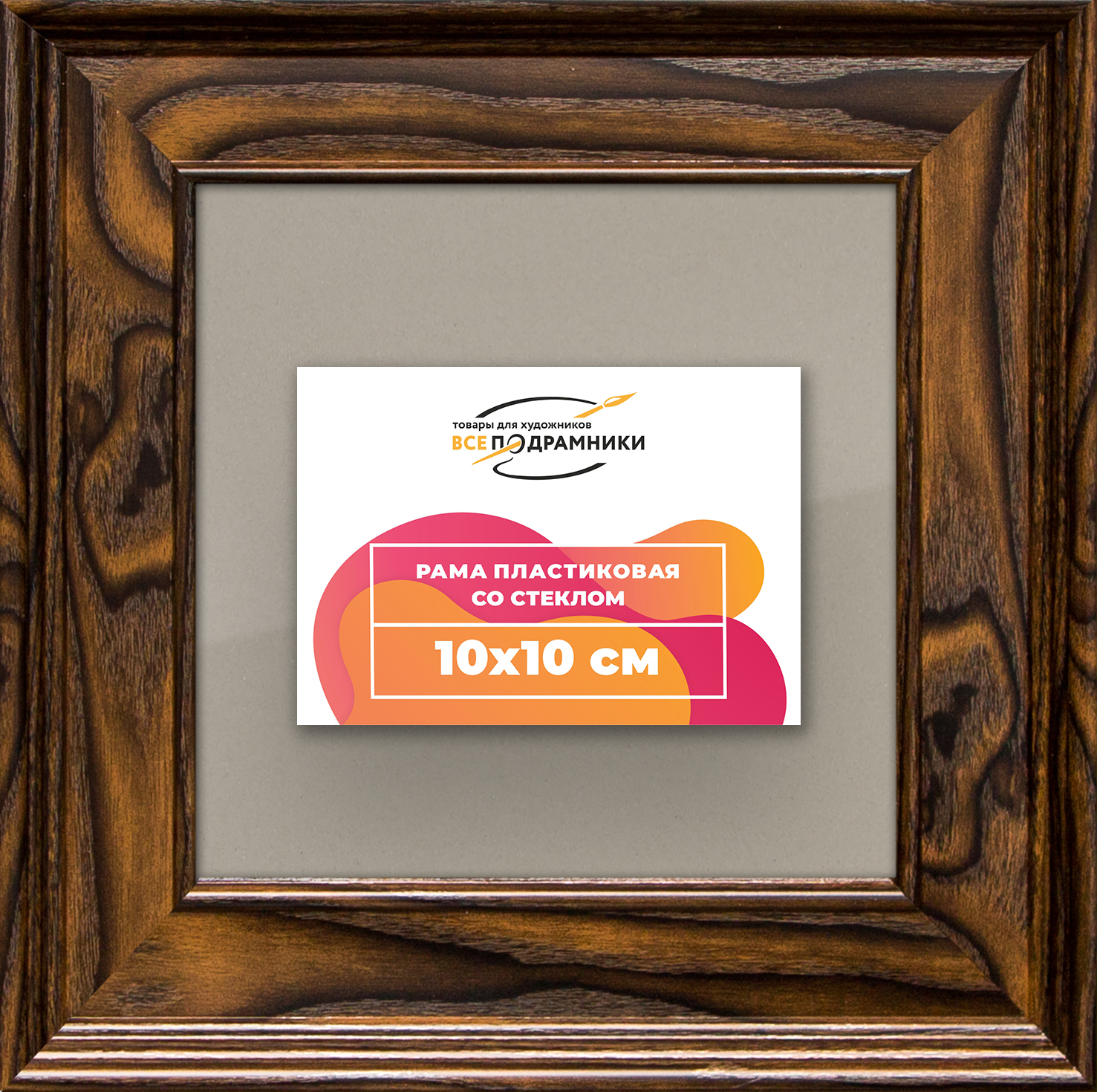 Пластиковая рама 10x10 со стеклом и задником Пластиковая рама со стеклом и задником изготовлена из безопасного и экологически чистого первичного полистирола высшей категории. Производитель: “ВсеПодрамники”. Для удобства установки к стандартному размеру добавлено 4 мм (по 2 мм с каждой стороны), чтобы ваше изделие легко поместилось в раму. 1. Основные характеристики: - Размеры рамки: 10x10 (по размеру помещаемого изображения) - Габариты изделия: 19.0x19.0 см. - Цвет: коричневый - Профиль: классический - Сечение рамы: 50x30 мм - Ширина четверти: 7 мм - Высота четверти: 10 мм 2. Комплектация: - Стекло 2мм (обычное) - Задник - Подвесная пластина – 2 шт. - Винты - Прижимы для фиксации задника 3. Назначение: - Подходит для оформления: • Картин, включая картины по номерам • Алмазных мозаик и вышивок крестом • Постеров, фотографий, икон • Паспарту, зеркал • Вышивки бисером и алмазной мозаики • Медалей, орденов, спортивных наград • Старинных часов, ключей, монет или украшений - Используется как настенная или настольная фоторамка (нет подставки) 4. Преимущества: - Универсальность: квадратные и прямоугольные форматы, размеры от 10х10 до 100х100 см - Удобство: можно повесить горизонтально или вертикально - Широкий выбор: разные профили, расцветки, с опцией со стеклом или без - Идеальный подарок: для мамы, папы, бабушки, дедушки, друзей, коллег на день рождения, Новый год, 8 марта, 23 февраля, свадьбу, новоселье или любой другой праздник 5. Применение в интерьере: - Украшение дома: подходит для изображений цветов, живописи, портретов, натюрмортов, городских пейзажей, природы - Идеально для алмазной вышивки, мозаики, фотографий или постера 6. Производство: - Страна: Россия, Санкт-Петербург - Качество: высококачественные материалы с вниманием к деталям