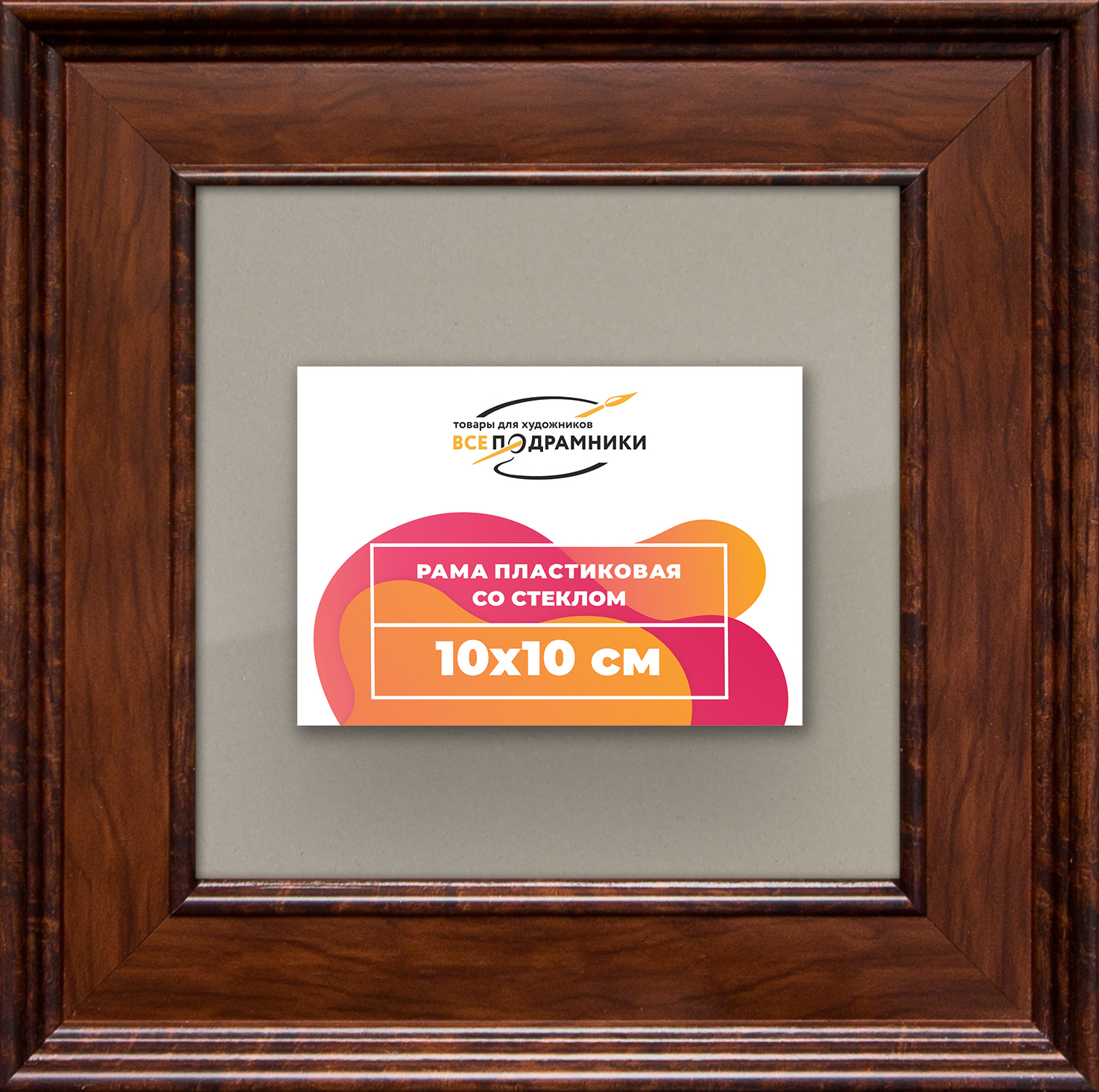 Пластиковая рама 10x10 со стеклом и задником Пластиковая рама со стеклом и задником изготовлена из безопасного и экологически чистого первичного полистирола высшей категории. Производитель: “ВсеПодрамники”. Для удобства установки к стандартному размеру добавлено 4 мм (по 2 мм с каждой стороны), чтобы ваше изделие легко поместилось в раму. 1. Основные характеристики: - Размеры рамки: 10x10 (по размеру помещаемого изображения) - Габариты изделия: 19.0x19.0 см. - Цвет: коричневый - Профиль: классический - Сечение рамы: 50x30 мм - Ширина четверти: 7 мм - Высота четверти: 10 мм 2. Комплектация: - Стекло 2мм (обычное) - Задник - Подвесная пластина – 2 шт. - Винты - Прижимы для фиксации задника 3. Назначение: - Подходит для оформления: • Картин, включая картины по номерам • Алмазных мозаик и вышивок крестом • Постеров, фотографий, икон • Паспарту, зеркал • Вышивки бисером и алмазной мозаики • Медалей, орденов, спортивных наград • Старинных часов, ключей, монет или украшений - Используется как настенная или настольная фоторамка (нет подставки) 4. Преимущества: - Универсальность: квадратные и прямоугольные форматы, размеры от 10х10 до 100х100 см - Удобство: можно повесить горизонтально или вертикально - Широкий выбор: разные профили, расцветки, с опцией со стеклом или без - Идеальный подарок: для мамы, папы, бабушки, дедушки, друзей, коллег на день рождения, Новый год, 8 марта, 23 февраля, свадьбу, новоселье или любой другой праздник 5. Применение в интерьере: - Украшение дома: подходит для изображений цветов, живописи, портретов, натюрмортов, городских пейзажей, природы - Идеально для алмазной вышивки, мозаики, фотографий или постера 6. Производство: - Страна: Россия, Санкт-Петербург - Качество: высококачественные материалы с вниманием к деталям
