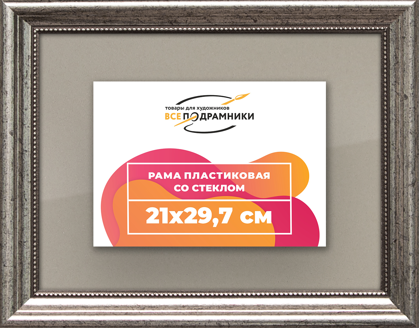 Пластиковая рама 21x29,7 со стеклом и задником Пластиковая рама со стеклом и задником изготовлена из безопасного и экологически чистого первичного полистирола высшей категории. Производитель: “ВсеПодрамники”. Для удобства установки к стандартному размеру добавлено 4 мм (по 2 мм с каждой стороны), чтобы ваше изделие легко поместилось в раму. 1. Основные характеристики: - Размеры рамки: 21x29,7 (по размеру помещаемого изображения) - Габариты изделия: 23.8x32.5 см. - Цвет: серебристый - Профиль: классический - Сечение рамы: 19x20 мм - Ширина четверти: 7 мм - Высота четверти: 10 мм 2. Комплектация: - Стекло 2мм (обычное) - Задник - Подвесная пластина – 2 шт. - Винты - Прижимы для фиксации задника 3. Назначение: - Подходит для оформления: • Картин, включая картины по номерам • Алмазных мозаик и вышивок крестом • Постеров, фотографий, икон • Паспарту, зеркал • Вышивки бисером и алмазной мозаики • Медалей, орденов, спортивных наград • Старинных часов, ключей, монет или украшений - Используется как настенная или настольная фоторамка (нет подставки) 4. Преимущества: - Универсальность: квадратные и прямоугольные форматы, размеры от 10х10 до 100х100 см - Удобство: можно повесить горизонтально или вертикально - Широкий выбор: разные профили, расцветки, с опцией со стеклом или без - Идеальный подарок: для мамы, папы, бабушки, дедушки, друзей, коллег на день рождения, Новый год, 8 марта, 23 февраля, свадьбу, новоселье или любой другой праздник 5. Применение в интерьере: - Украшение дома: подходит для изображений цветов, живописи, портретов, натюрмортов, городских пейзажей, природы - Идеально для алмазной вышивки, мозаики, фотографий или постера 6. Производство: - Страна: Россия, Санкт-Петербург - Качество: высококачественные материалы с вниманием к деталям