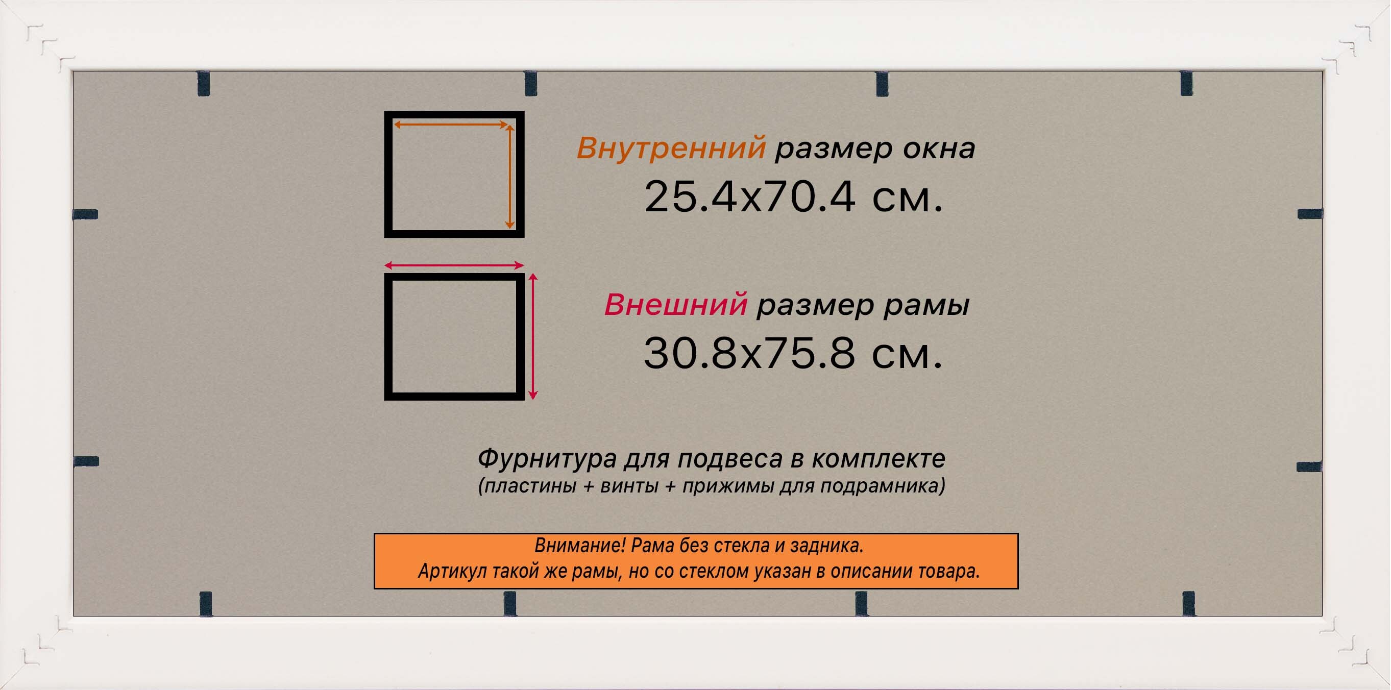 Пластиковая рама 25x70 со стеклом и задником Пластиковая рама со стеклом и задником изготовлена из безопасного и экологически чистого первичного полистирола высшей категории. Производитель: “ВсеПодрамники”. Для удобства установки к стандартному размеру добавлено 4 мм (по 2 мм с каждой стороны), чтобы ваше изделие легко поместилось в раму. 1. Основные характеристики: - Размеры рамки: 25x70 (по размеру помещаемого изображения) - Габариты изделия: 30.8x75.8 см. - Цвет: коричневый - Профиль: классический - Сечение рамы: 34x24 мм - Ширина четверти: 7 мм - Высота четверти: 10 мм 2. Комплектация: - Стекло 2мм (обычное) - Задник - Подвесная пластина – 2 шт. - Винты - Прижимы для фиксации задника 3. Назначение: - Подходит для оформления: • Картин, включая картины по номерам • Алмазных мозаик и вышивок крестом • Постеров, фотографий, икон • Паспарту, зеркал • Вышивки бисером и алмазной мозаики • Медалей, орденов, спортивных наград • Старинных часов, ключей, монет или украшений - Используется как настенная или настольная фоторамка (нет подставки) 4. Преимущества: - Универсальность: квадратные и прямоугольные форматы, размеры от 10х10 до 100х100 см - Удобство: можно повесить горизонтально или вертикально - Широкий выбор: разные профили, расцветки, с опцией со стеклом или без - Идеальный подарок: для мамы, папы, бабушки, дедушки, друзей, коллег на день рождения, Новый год, 8 марта, 23 февраля, свадьбу, новоселье или любой другой праздник 5. Применение в интерьере: - Украшение дома: подходит для изображений цветов, живописи, портретов, натюрмортов, городских пейзажей, природы - Идеально для алмазной вышивки, мозаики, фотографий или постера 6. Производство: - Страна: Россия, Санкт-Петербург - Качество: высококачественные материалы с вниманием к деталям