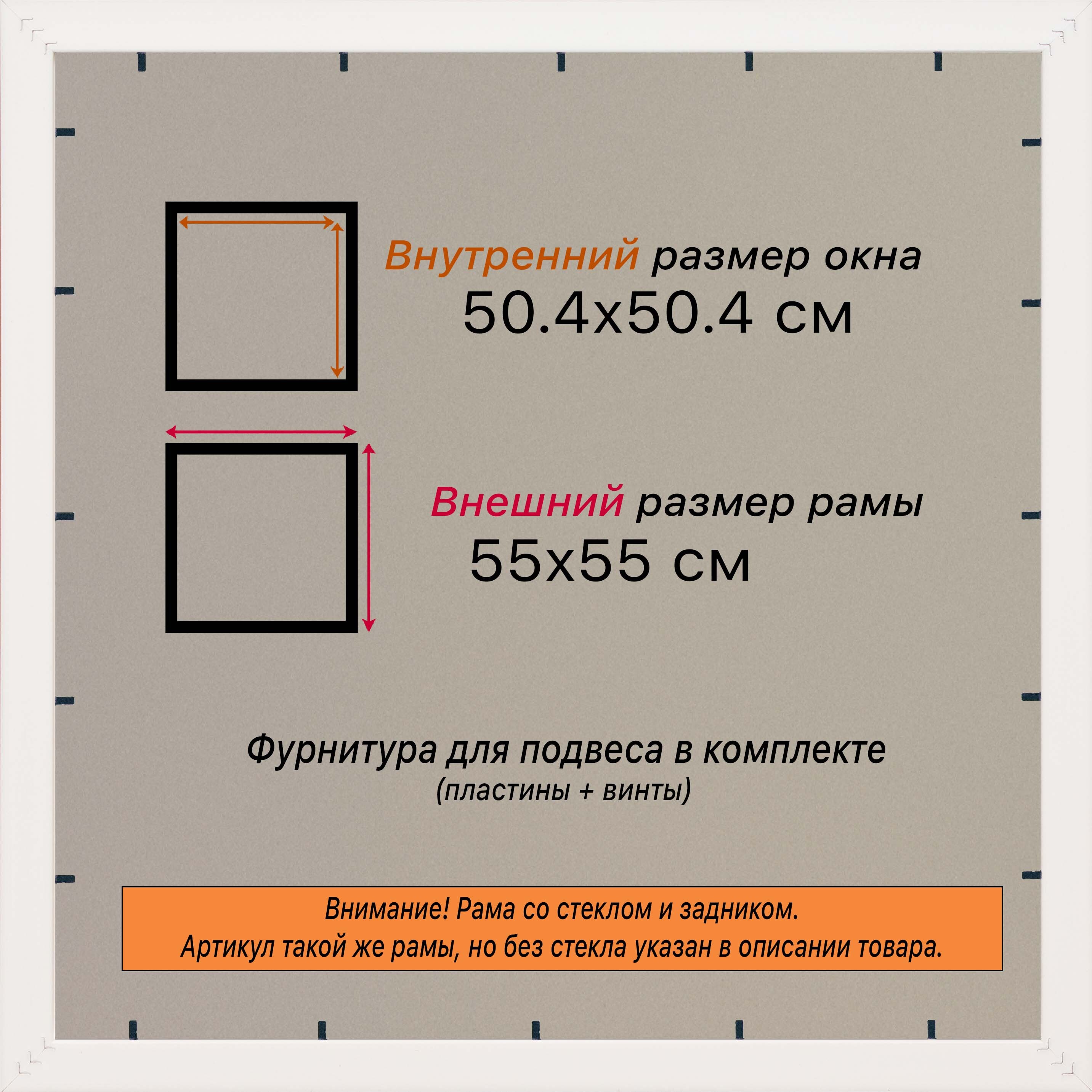 Пластиковая рама 50x50 со стеклом и задником Пластиковая рама со стеклом и задником изготовлена из безопасного и экологически чистого первичного полистирола высшей категории. Производитель: “ВсеПодрамники”. Для удобства установки к стандартному размеру добавлено 4 мм (по 2 мм с каждой стороны), чтобы ваше изделие легко поместилось в раму. 1. Основные характеристики: - Размеры рамки: 50x50 (по размеру помещаемого изображения) - Габариты изделия: 55.0x55.0 см. - Цвет: серебристый - Профиль: классический - Сечение рамы: 30x16 мм - Ширина четверти: 7 мм - Высота четверти: 10 мм 2. Комплектация: - Стекло 2мм (обычное) - Задник - Подвесная пластина – 2 шт. - Винты - Прижимы для фиксации задника 3. Назначение: - Подходит для оформления: • Картин, включая картины по номерам • Алмазных мозаик и вышивок крестом • Постеров, фотографий, икон • Паспарту, зеркал • Вышивки бисером и алмазной мозаики • Медалей, орденов, спортивных наград • Старинных часов, ключей, монет или украшений - Используется как настенная или настольная фоторамка (нет подставки) 4. Преимущества: - Универсальность: квадратные и прямоугольные форматы, размеры от 10х10 до 100х100 см - Удобство: можно повесить горизонтально или вертикально - Широкий выбор: разные профили, расцветки, с опцией со стеклом или без - Идеальный подарок: для мамы, папы, бабушки, дедушки, друзей, коллег на день рождения, Новый год, 8 марта, 23 февраля, свадьбу, новоселье или любой другой праздник 5. Применение в интерьере: - Украшение дома: подходит для изображений цветов, живописи, портретов, натюрмортов, городских пейзажей, природы - Идеально для алмазной вышивки, мозаики, фотографий или постера 6. Производство: - Страна: Россия, Санкт-Петербург - Качество: высококачественные материалы с вниманием к деталям