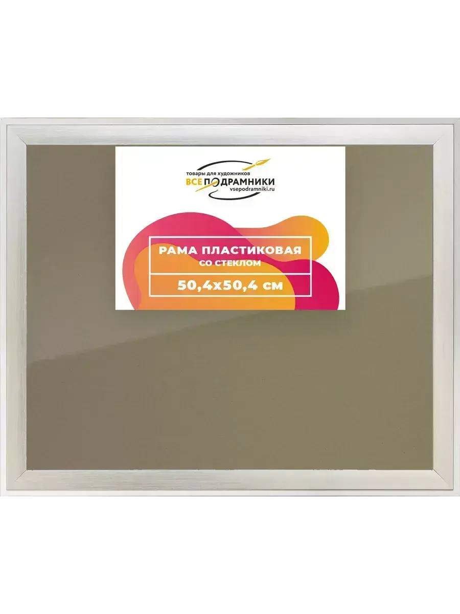 Пластиковая рама 50x50 со стеклом и задником Пластиковая рама со стеклом и задником изготовлена из безопасного и экологически чистого первичного полистирола высшей категории. Производитель: “ВсеПодрамники”. Для удобства установки к стандартному размеру добавлено 4 мм (по 2 мм с каждой стороны), чтобы ваше изделие легко поместилось в раму. 1. Основные характеристики: - Размеры рамки: 50x50 (по размеру помещаемого изображения) - Габариты изделия: 56.0x56.0 см. - Цвет: серебристый - Профиль: классический - Сечение рамы: 35x15 мм - Ширина четверти: 7 мм - Высота четверти: 10 мм 2. Комплектация: - Стекло 2мм (обычное) - Задник - Подвесная пластина – 2 шт. - Винты - Прижимы для фиксации задника 3. Назначение: - Подходит для оформления: • Картин, включая картины по номерам • Алмазных мозаик и вышивок крестом • Постеров, фотографий, икон • Паспарту, зеркал • Вышивки бисером и алмазной мозаики • Медалей, орденов, спортивных наград • Старинных часов, ключей, монет или украшений - Используется как настенная или настольная фоторамка (нет подставки) 4. Преимущества: - Универсальность: квадратные и прямоугольные форматы, размеры от 10х10 до 100х100 см - Удобство: можно повесить горизонтально или вертикально - Широкий выбор: разные профили, расцветки, с опцией со стеклом или без - Идеальный подарок: для мамы, папы, бабушки, дедушки, друзей, коллег на день рождения, Новый год, 8 марта, 23 февраля, свадьбу, новоселье или любой другой праздник 5. Применение в интерьере: - Украшение дома: подходит для изображений цветов, живописи, портретов, натюрмортов, городских пейзажей, природы - Идеально для алмазной вышивки, мозаики, фотографий или постера 6. Производство: - Страна: Россия, Санкт-Петербург - Качество: высококачественные материалы с вниманием к деталям