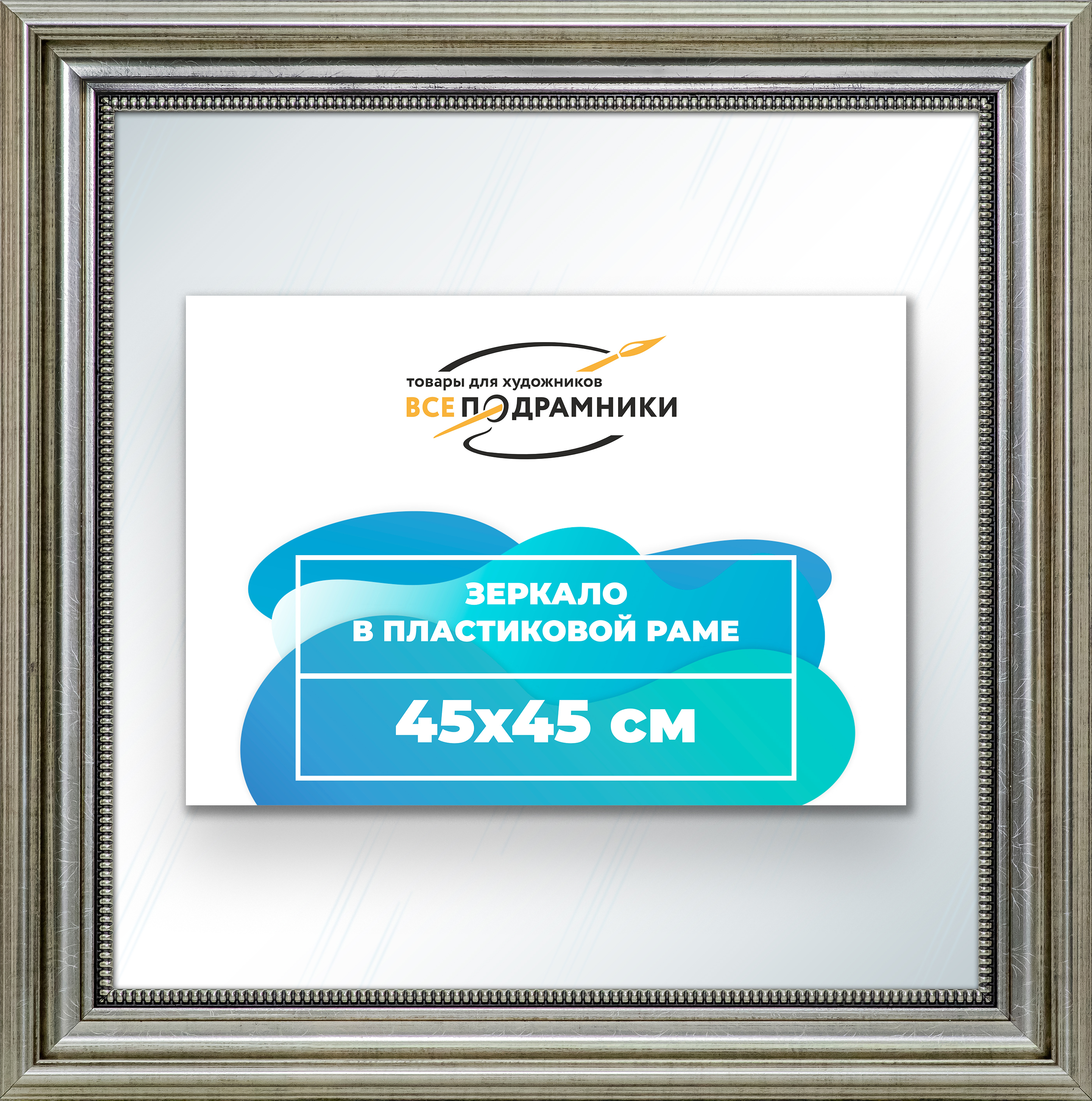 Наше зеркало настенное в раме — идеальный выбор для создания уюта и функциональности. Изготовлено из экологически чистого первичного полистирола высшей категории. Противоосколочная пленка на задней стороне защищает от разлета осколков. Каждое зеркало в раме тщательно очищено — никаких отпечатков, разводов или пыли. Ручная сборка гарантирует качество и внимание к деталям. Подходит для прихожей, ванной, спальни, офиса или как зеркало напольное в полный рост. Технические характеристики * Внешний размер в раме: 45x45.0 см. * Размер зеркального полотна без рамы: 35x35.0 см. * Сечение рамы: 50x26 мм. * Цвет рамы: серебристый. * Профиль рамы: классический. * Форма: Квадратная. * Толщина зеркала: 4 мм. Комплектация * Зеркало в пластиковой раме. * Подвесная пластина – 2 шт. * Винты и фурнитура для крепления. * Все для быстрой установки в комплекте. Преимущества зеркала * Экологичность и безопасность: Рама из полистирола без вредных веществ + противоосколочная пленка. * Долговечность: Полотно толщиной 4 мм для четкого отражения и прочности. * Универсальность: Прямоугольные и квадратные форматы, множество размеров от 10x10 до 100x200 см. * Удобство: Возможность повесить горизонтально или вертикально. * Широкий выбор: Разные профили и цвета рам. * Идеальный подарок: Для мамы, папы, друзей, коллег на день рождения, Новый год, 8 марта, 23 февраля, свадьбу, новоселье. Где использовать зеркало * Зеркало в прихожую: Для проверки образа перед выходом. * Зеркало для ванной: Устойчиво к влаге. * Зеркало в гостиную или спальню: Декоративный акцент, расширяющий пространство. * Зеркало в офис: Для комфортной и стильной атмосферы. * Зеркало напольное в полный рост: Идеально для примерки одежды. * Зеркало декоративное впишется в любой интерьер — от классики до лофта. Производство * Страна: Россия, Санкт-Петербург. * Качество: Высококачественные материалы, ручная сборка, строгие стандарты. Размеры и варианты Широкий выбор зеркал настенных и напольных: прямоугольные и квадратные, множество размеров от 10x10 до 100x200 см, разные профили и цвета рам. Напишите нам в чат, и мы поможем подобрать зеркало, раму и изготовим любой размер по вашим пожеланиям. Найдите свое идеальное зеркало для интерьера.